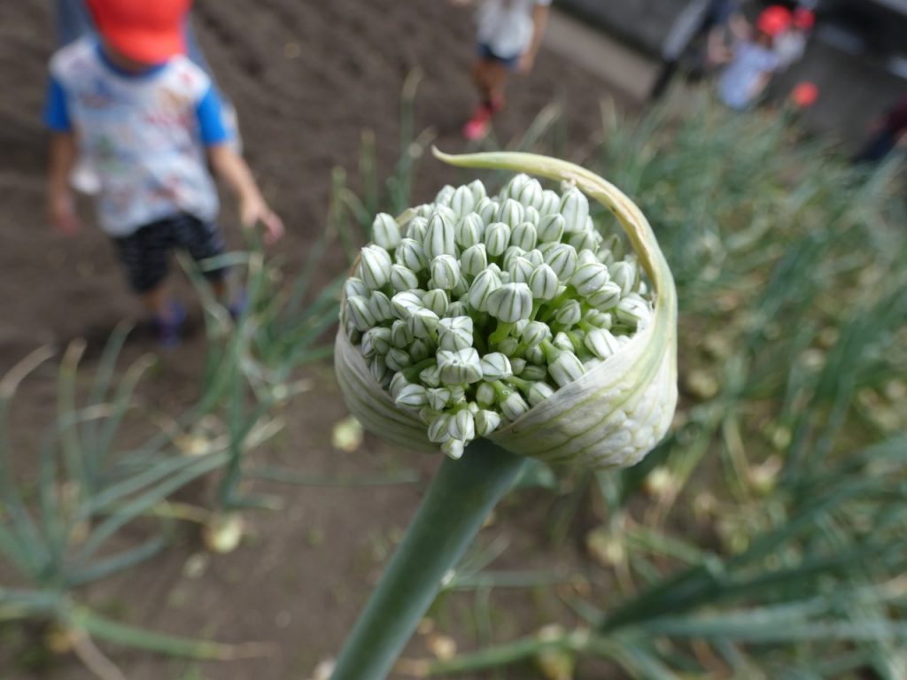 避難訓練の後、年長組はすみやかにバスに乗ってプレイルームの畑に移動しました。収穫を迎えた玉ねぎを掘るためです。到着すると大きな玉ねぎが地面から顔を出しています。ネギ坊主の花ももう少しで開きそうです。