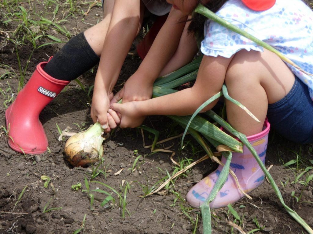 子どもたちはそれぞれ位置について玉ねぎを取ろうとしますが、地面から顔を出しているにもかかわらず、根が張っているので抜けにくいのです。苦戦しながら1個、2個と収穫して、一度前に倒してから手前に引き倒しながら抜くと楽だという事に一番最初に気づいたのはAちゃんでした。その後「てつだって~!」の声にも速やかに寄って協力しながら抜いたりしていました。