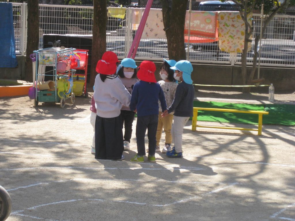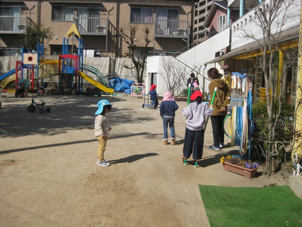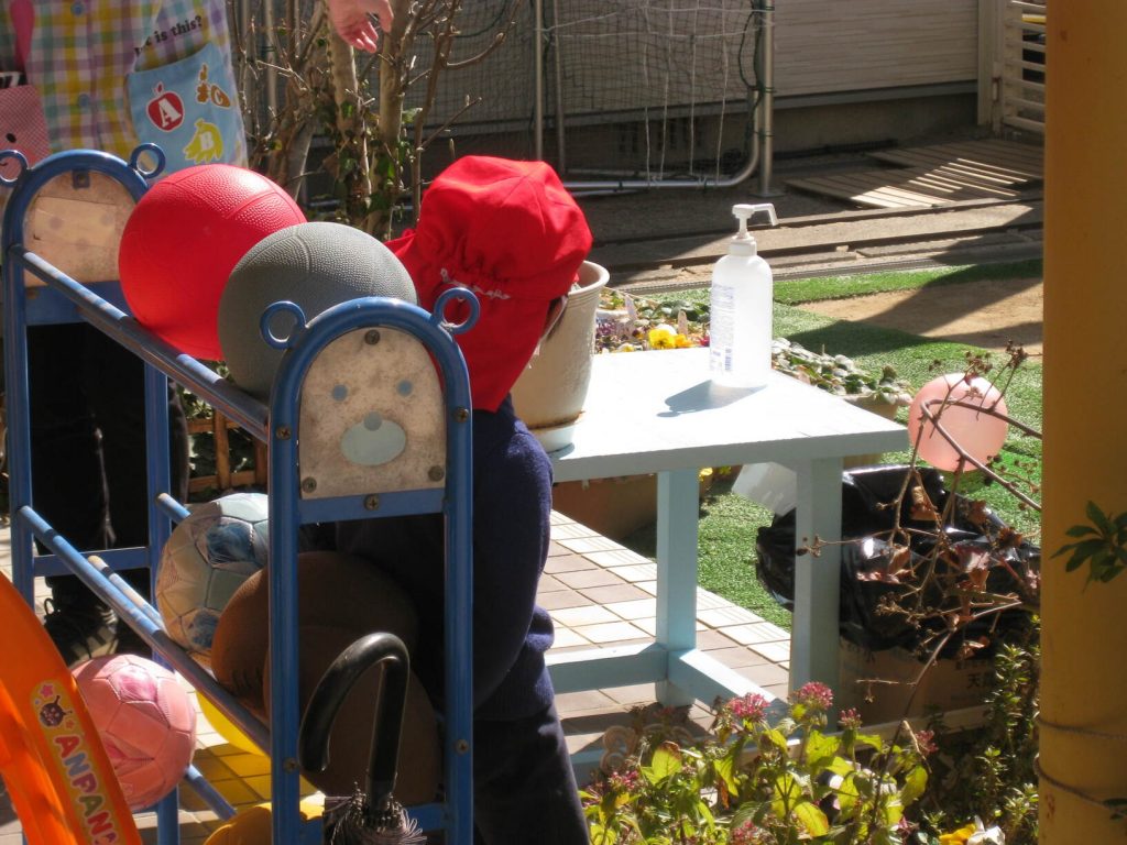 そんな中で集まってきた子どもたちは園庭でそれぞれの遊びを展開し、異年齢児によるかくれんぼが行われました。