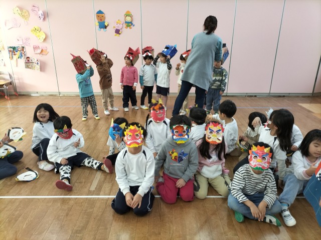 今年は2月2日が節分だったようですが、日曜日なので気にせず2月3日に豆まきを行いました。各クラスがそれぞれ鬼のお面を作って記念写真を撮りながら、お腹の中のオニを追い出す・・・ということで、みんな集まって記念写真を撮り終えて、オニの絵本を見ながら過ごしていると・・・後ろのドアがいきなり開いてオニが登場しました。