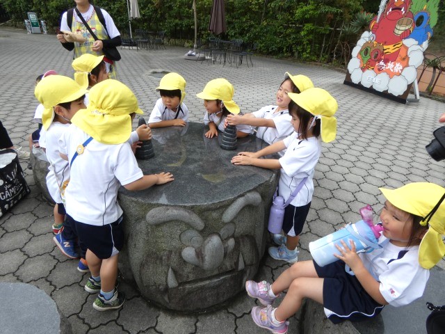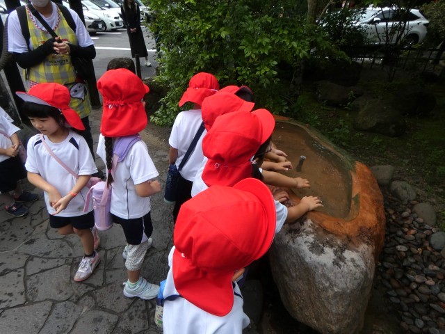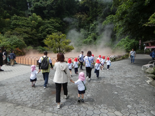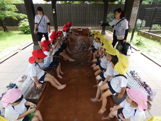 その後年長は上から全体を見渡しに出かけ、年中と年少は記念写真を撮って、園長が柵を超えて赤い泥を柄杓ですくうのを見ていました(ちゃんと許可を得ています)。足湯があるのでみんなで入っていました。