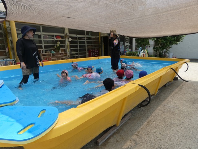 年中組と年少組は年長組がプールから出た後に水位を下げて入りました。